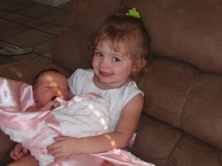 Saige always laughs at Lillie. Its so funny. She loves her little sister so much already. A cute thing... Saige never calls Lillie, Lillie she always calls her baby. I guess I was the same way with my brother Jared when he was born. He was always my baby.